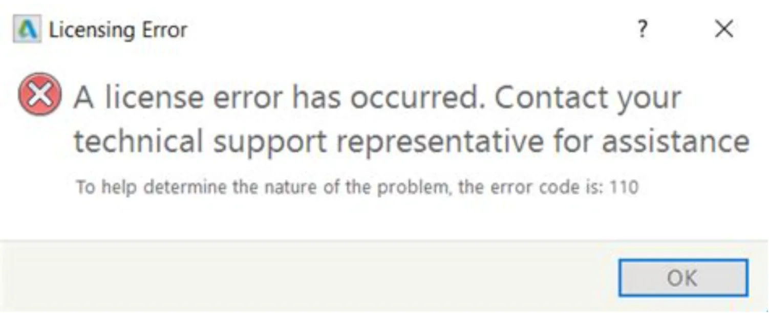 A license error has occurred. Contact yourtechnical support representative for assistanceTo help determine the nature of the problem, the error code is: 110