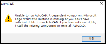 - After clicking “Download” or proceeding, a second error appears: “Unable to run AutoCAD. A dependent component MicrosoftEdge WebView2 Runtime Is missing or you don’t havesufficient rights to run AutoCAD. If you have sufficient rights,install the missing component or reinstall AutoCAD.”