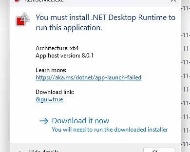 - First, the message “You must install .NET Desktop Runtime” is displayed.