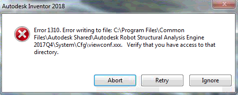 Error 1310: Error writing to file. Verify that you have access to that directory.Error 1304: Error writing to file. Verify that you have access to that directory.- Error 1310. Error writing to file: C:\Program Files\CommonFiles\Autodesk Shared\Autodesk Robot Structural Analysis Engine2017Q4\System\Cfg \viewconf.oo. Verify that you have access to thatdirectory.