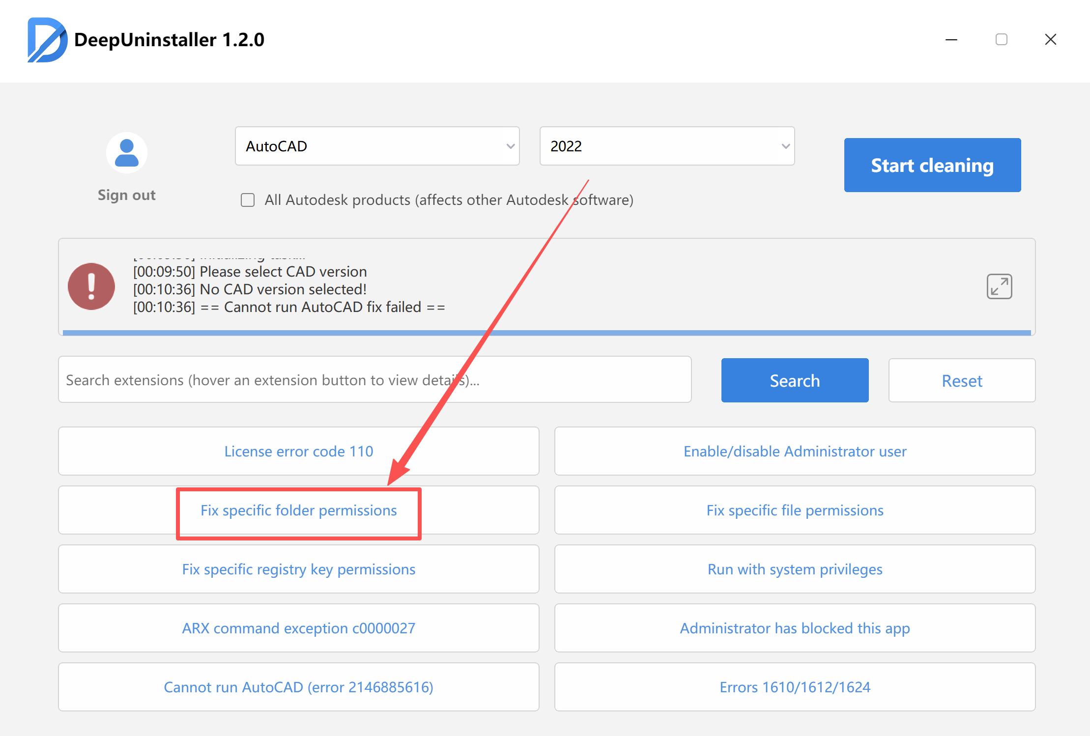 - Open deepuninstaller.Go to Extended Features.Click the Fix specific folder permissions button.