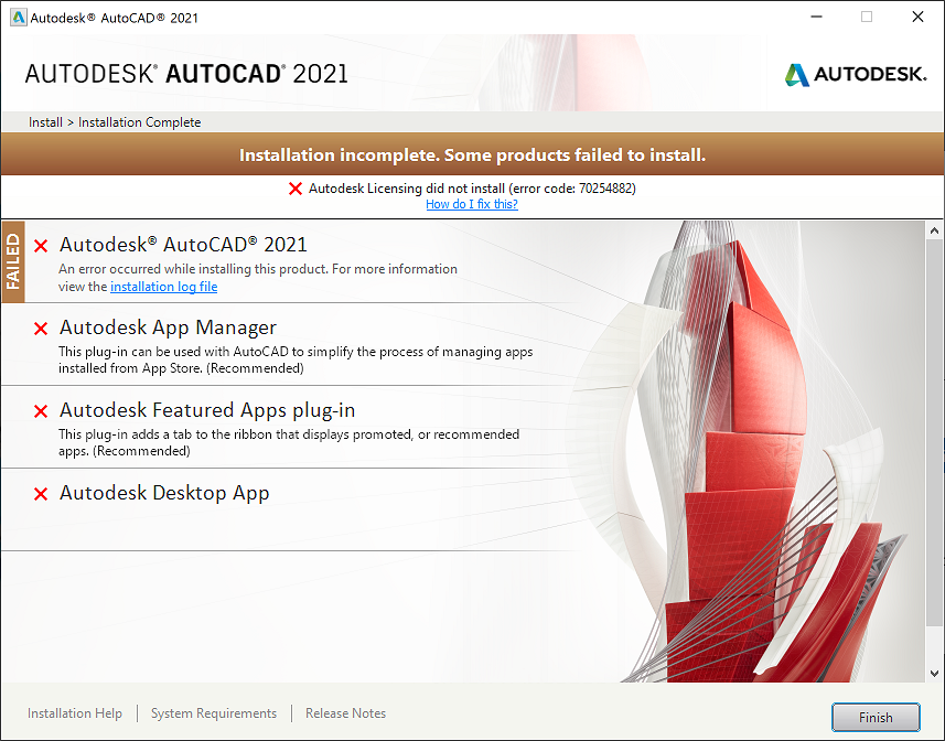 During the installation of Autodesk software, the following error messages may appear, indicating an incomplete installation where some products or the Autodesk Licensing Service (ADLS) could not be installed: