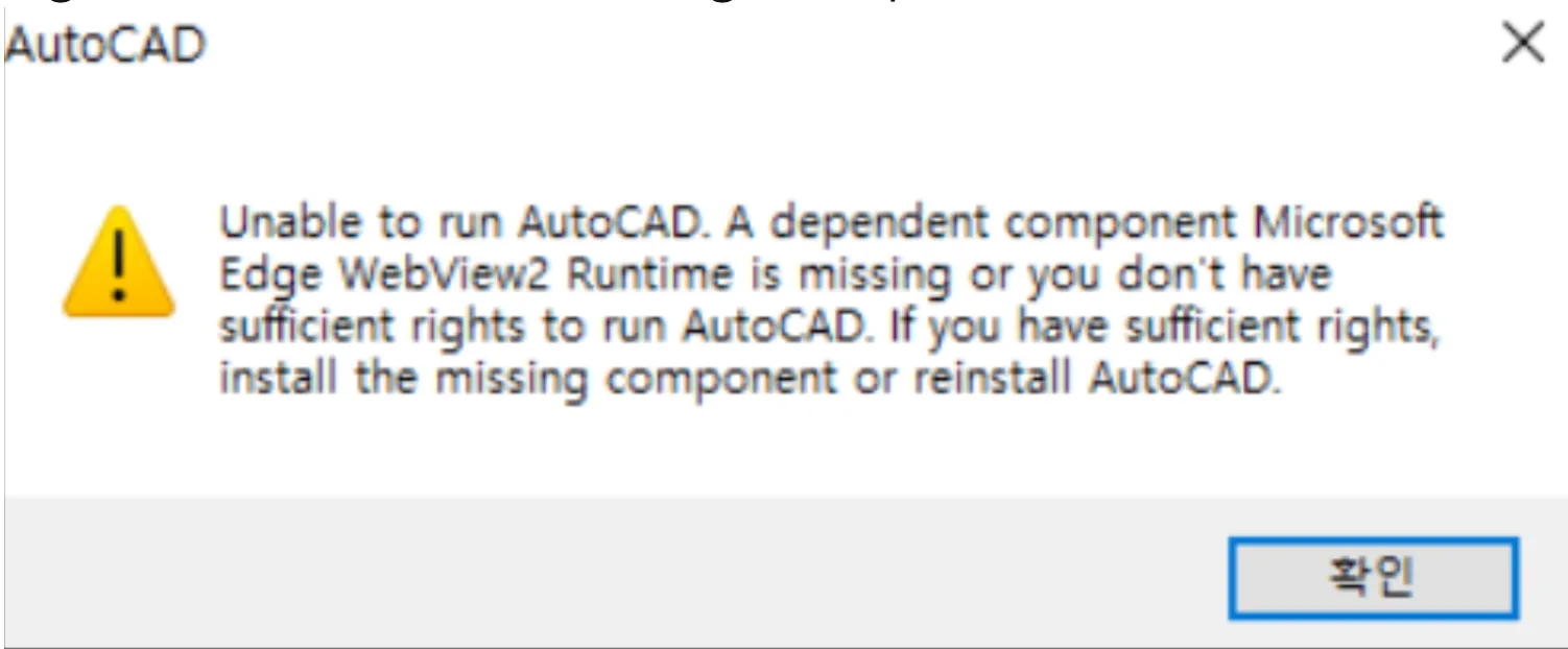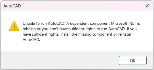 This issue typically occurs when essential dependency components required by AutoCAD, such as Microsoft Edge WebView2 Runtime or specific .NET Desktop Runtime versions, are either missing or improperly installed on the system.