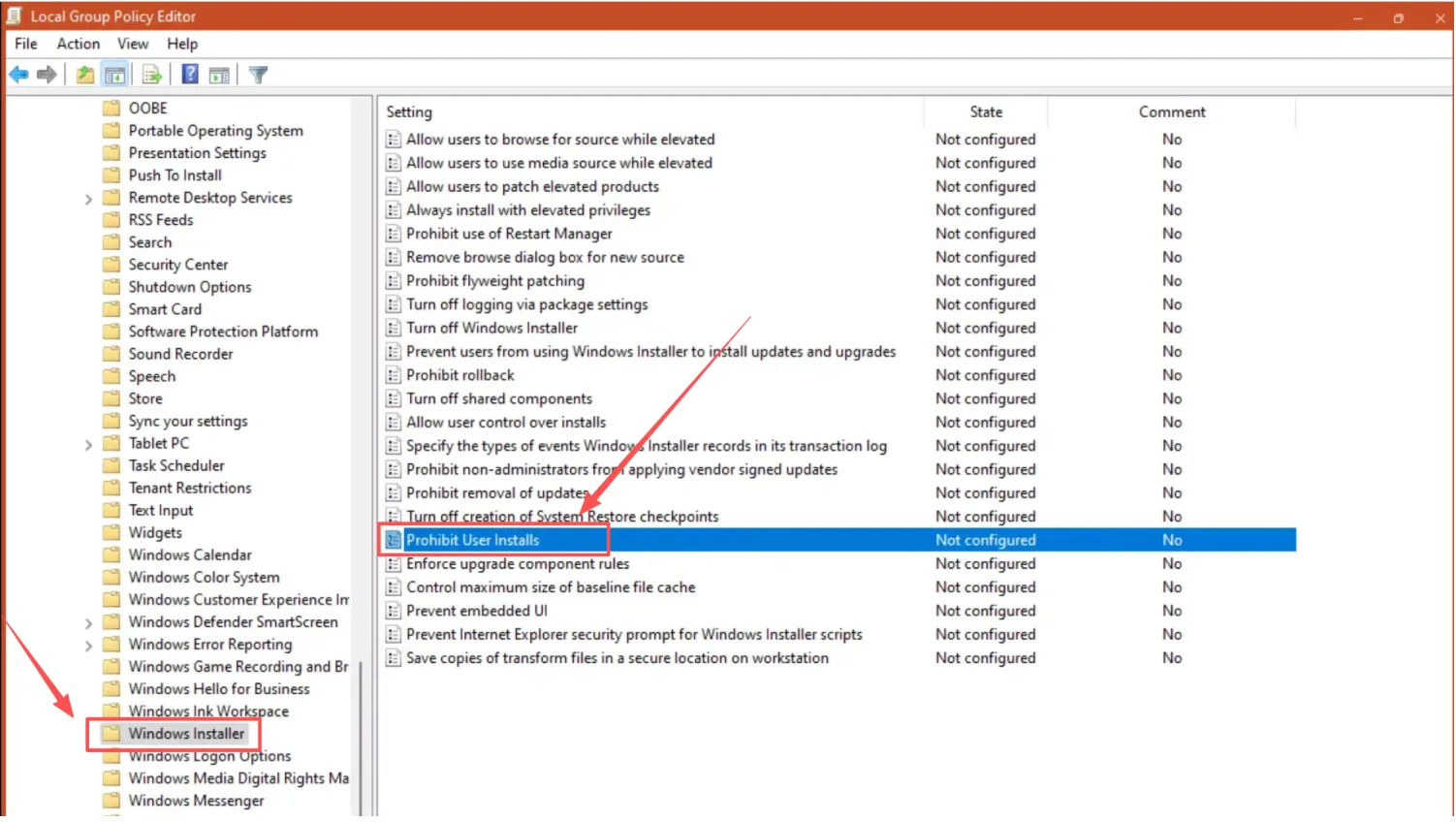 Computer Configuration > Administrative Templates > Windows Components > Windows Installer - Double-click the “Prohibit User Installs” setting.