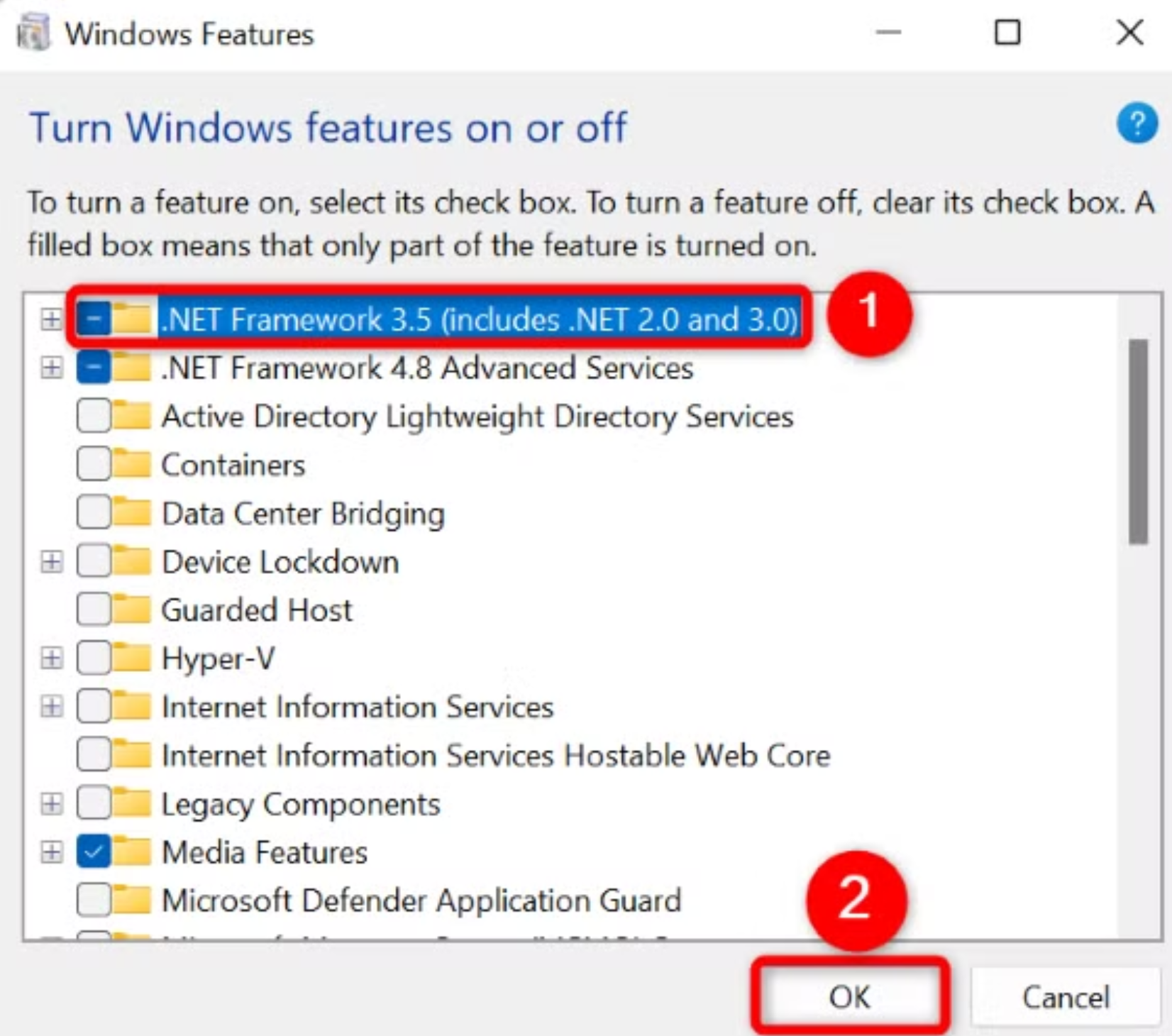 - Check the box next to .NET Framework 3.5 (includes .NET 2.0 and 3.0).