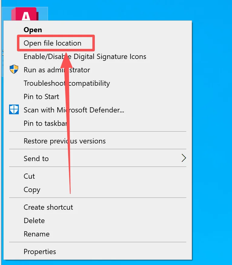 - Right-click the AutoCAD desktop icon (or the AutoCAD executable in the Start Menu) that is displaying the pop-up, then select Open file location.Image Placeholder: Illustrates right-clicking AutoCAD icon