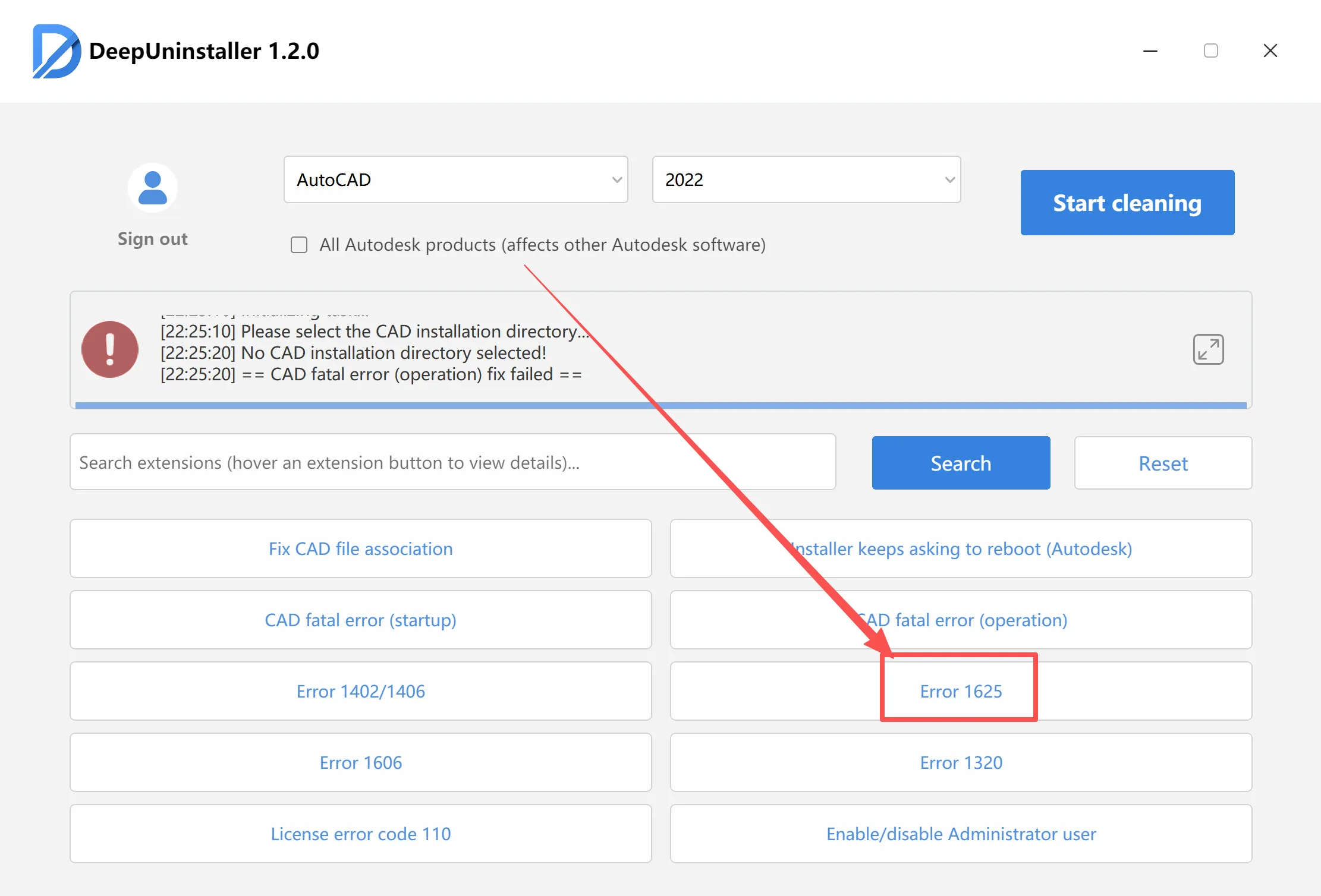 deepuninstallertool. Open its extensions and click on the “Error 1625” option.